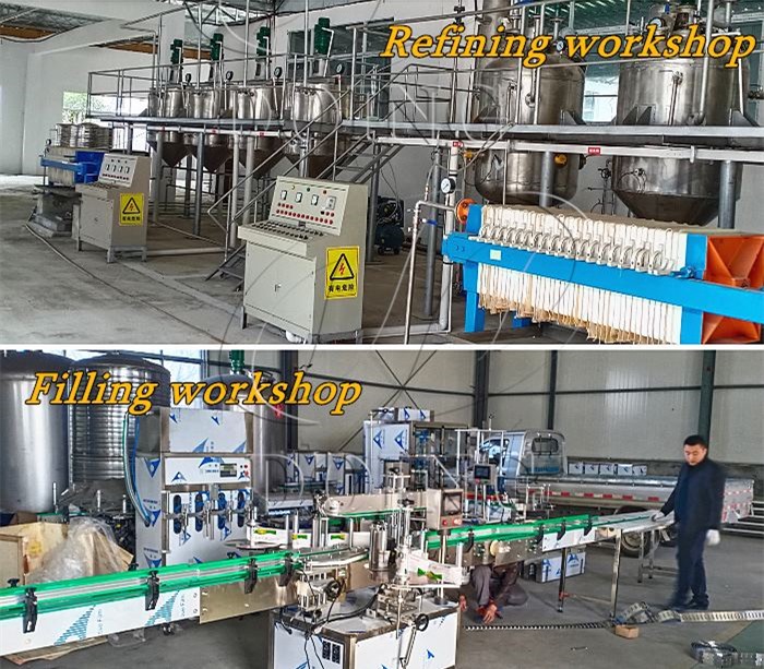 The other major device mentioned in the video is cooking oil filling machine, it belongs to the auxiliary equipment of edible oil factory, it can automatically and accurately fill the filtered edible oil or refined edible oil into bottles of different sizes. The automatic edible oil filling production line includes unscrambler of bottle, automatic edible oil filling machine, capping machine, labeling machine, etc., which can realize fully automated production, high efficiency and saving manpower. In addition, the capacity of the automatic edible oil filling line has different scale, which can be customized depending on the actual needs of customers.